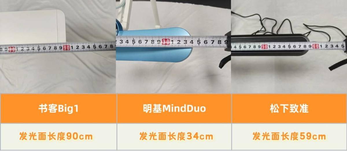 发光面尺寸直接影响照明范围,更大的发光面能提供更宽广均匀的光照区域。我们使用卷尺精确测量了三款台灯的发光面长度,并观察实际光照覆盖效果。