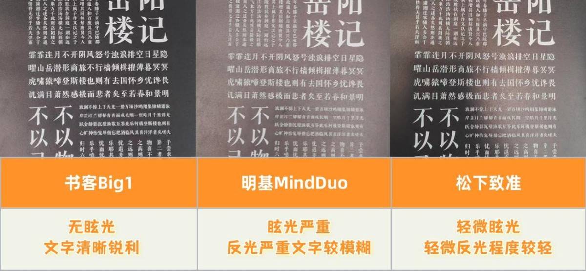 书客Big1采用全光域防眩光技术4.0,实现了出色的眩光控制,光面书本几乎没有眩光现象,而且光线经过八重光学矩阵柔化后入眼极为舒适,即使直视光源也无刺眼感。松下致准存在轻微眩光,在特定角度下会出现反光,但总体不影响使用。明基MindDuo眩光现象较为明显,长时间使用可能引起视觉不适。