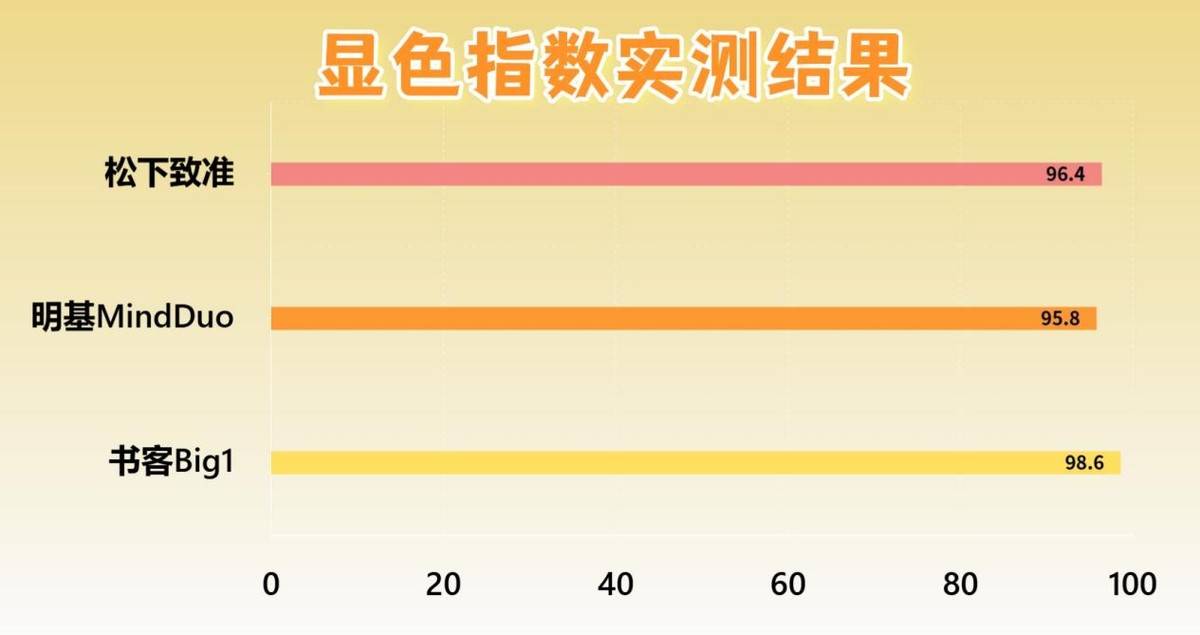 书客Big1以Ra98.6的显色指数表现最好,能高度还原物体真实色彩,文字边缘清晰,色彩过渡柔和,特别适合绘画、阅读彩色绘本等场景。松下致准Ra96.4的表现良好,超过Ra95的优秀标准。明基MindDuo Ra95.8的显色指数达标,但在色彩细腻度上与前两者存在一定差距,色彩层次感稍弱。