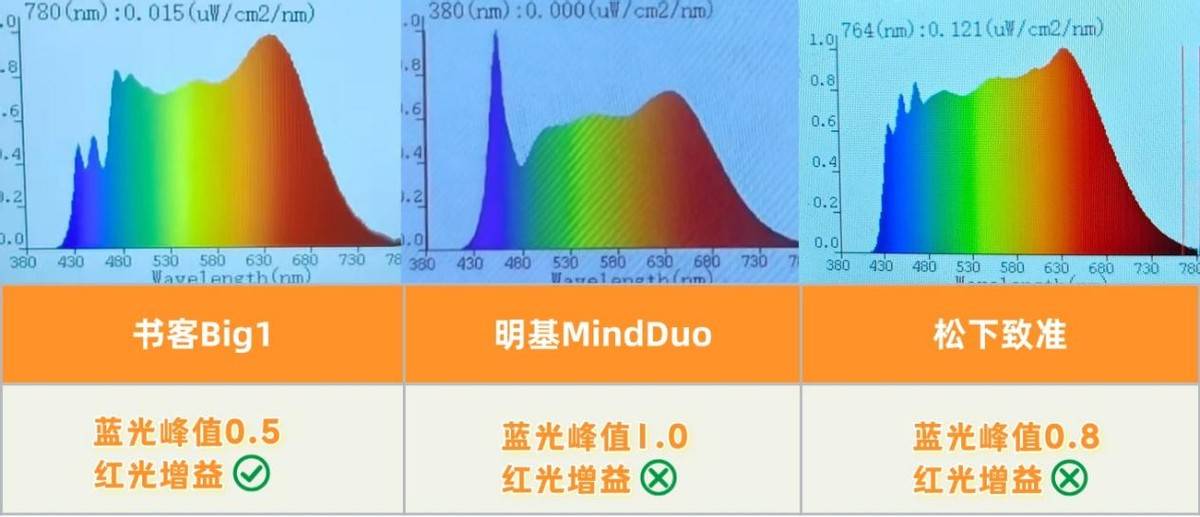 书客Big1表现最优,实测蓝光峰值仅为0.5,同时具备明显的红光增益,这得益于其SunArc三芯片全光谱灯珠和RRT3.0红光养眼技术的协同作用,让光线更温润柔和,用久也不疲劳,而且光谱曲线过度顺滑,接近自然光。松下致准蓝光峰值为0.8,符合基础安全标准,但缺乏红光补充。明基MindDuo蓝光峰值达到1.0,在蓝光控制方面相对较弱,且同样没有红光增益设计。