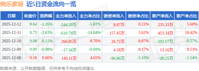 证券之星消息,截至2025年12月12日收盘,我乐家居(603326)报收于8.64元,下跌1.26%,换手率1.5%,成交量4.8万手,成交额4200.55万元。