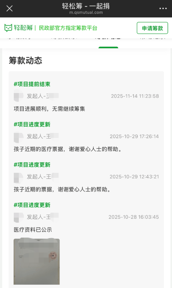 记者注意到,上述轻松筹链接显示求助发起人为患者父亲王某,其3岁的女儿王某某身患严重血液病,急需筹款20万元,已筹金额8900余元。筹款动态显示,该筹款项目已提前结束,结束时间是2025年11月14日。发起人称“项目进展顺利,无需继续筹集”。