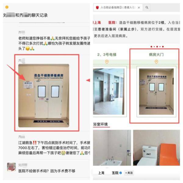 齐某给赵曼发送的病房照片(左图)、上海某医院官方公众号文章配图(右图)