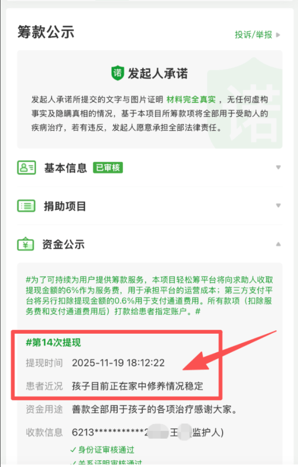 值得注意的是,上述齐某在11月15日发送给赵曼的微信消息中却说,王某某病情恶化,已送到ICU重症监护室。此外,记者在筹款链接资金公示处看到,11月19日,王某某的监护人发起了第14次提现。其中,在患者近况一栏写道:“孩子目前正在家中休养情况稳定。”