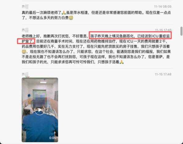 “11月12日,齐某给我发消息说医院已经下达了病危通知书,必须要赶紧手术,孩子还差最后八万元做手术。”赵曼回忆,11月14日和15日,齐某再次发消息称孩子病情恶化,已经送到ICU重症监护室。“17日她又说已筹集了九万多元,这周就必须进行手术,但还差一点费用希望得到帮助。”