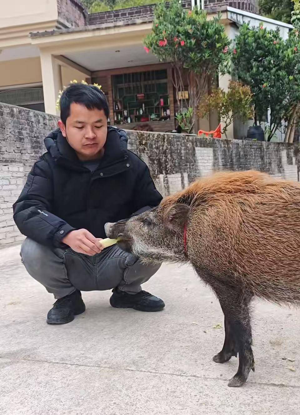 2024年11月,一头通体棕黄、四足乌黑的小野猪闯进家门,广州市民罗先生煮了盆面条“招待”它。没想到,这头野猪随后连续三天上门“乞食”,罗先生于是将它留养,并给它取名“面条”。如今,“面条”已从30斤长到150斤。