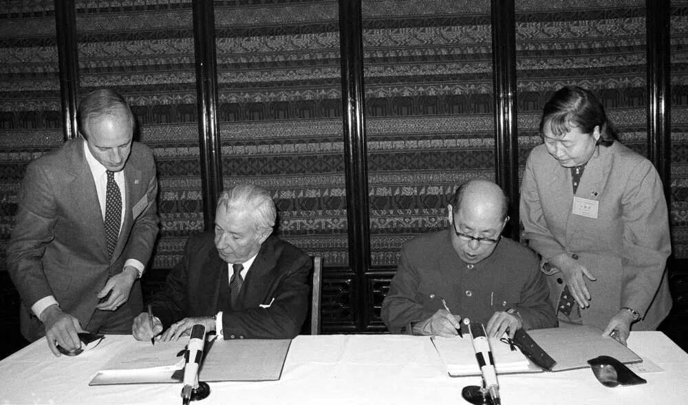 1984年3月21日,王丙乾同志和美国财政部长唐纳德·里甘分别代表两国政府草签协定。新华社记者 李平 摄