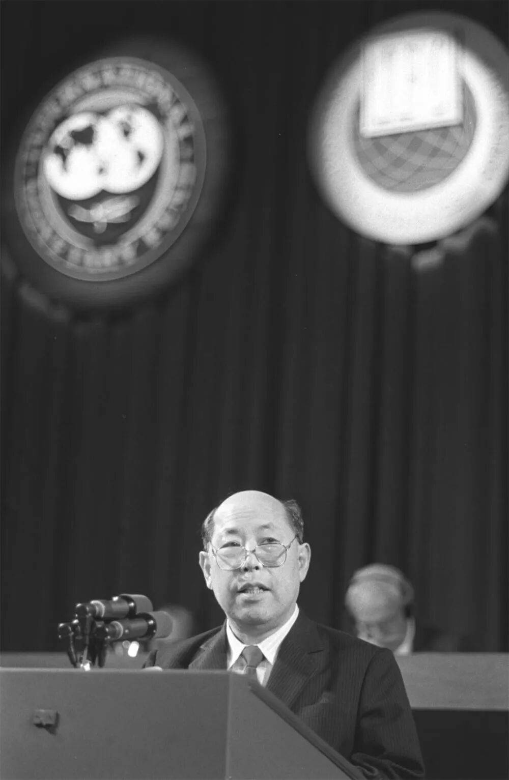1990年9月25日,国际货币基金组织和世界银行年会在美国首都华盛顿开幕。这是王丙乾同志在会上发言。新华社记者 韩居策 摄