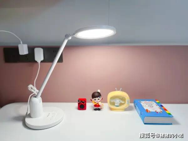 台灯外观是那种简约又干净的白色,摆在书桌上显得文静又大方,无论是搭配实木书桌,还是放在卡通风格的学习桌上,都非常协调。底座是圆形的,直径大约15厘米,也就只占了小半张A4纸的面积,旁边再摆放键盘、笔筒之类的物品完全不会觉得拥挤。