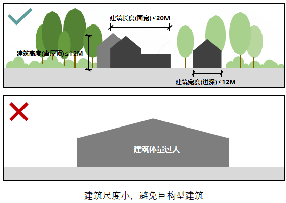 农房建筑长、宽、高比例协调,以小尺度为主,避免出现巨构型的建筑,单个建筑连续长度不宜过长。