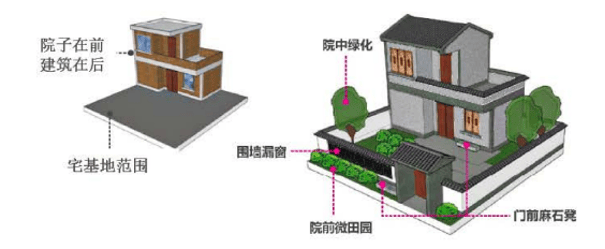 庭院功能上应兼顾乡村农产需求与城市休闲需要,预留部分农具摆放、谷实晾晒的空间,庭院铺装宜以自然的青石砖、青石板为主,但硬质面积不宜过大,且应结合周边植物布置,院落内的非硬化土地可保留作为农用地种植农作物和经济作物。