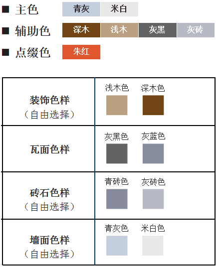 建筑色彩宜古朴协调,选用青灰、米白为主色调,融合木质原色作为辅助色,形成微妙的层次变化,空调外机、栏杆等附属设施颜色与建筑主体一致。单栋建筑色彩不宜超过三种,且不宜采用突兀、饱和度过高的颜色作为主色系。