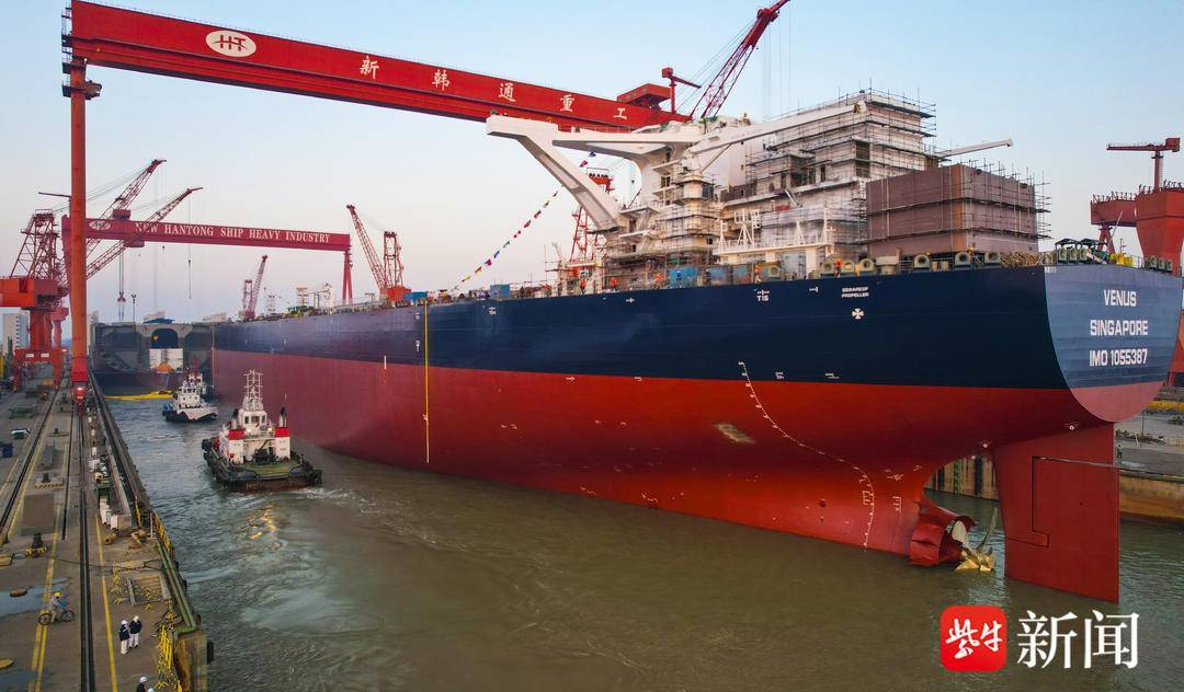 扬子晚报网1月8日讯(通讯员 孙世权 黄帅 记者 万凌云 姜天圣) 1月7日上午,镇江史上最大新造船——31.9万载重吨“绿色”超大型油轮(VLCC)“韩通373”轮顺利出坞。该船集成国际最高排放等级主机及节能装置,是名副其实的“绿色巨轮”。