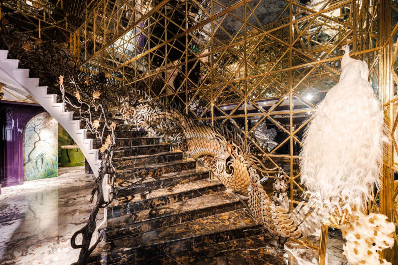 一层接待区是客人走进北京玫瑰坊的第一印象,不只要“奢华”,更要传递出东方的庄重与底蕴。郭培老师一直想找一种材质,不仅能奠定空间的基调,也能承载东方美学的灵魂;既要有故宫琉璃瓦般的温润与力量,又要有如金绣技艺中那种“于细节处见乾坤”的匠心精神。