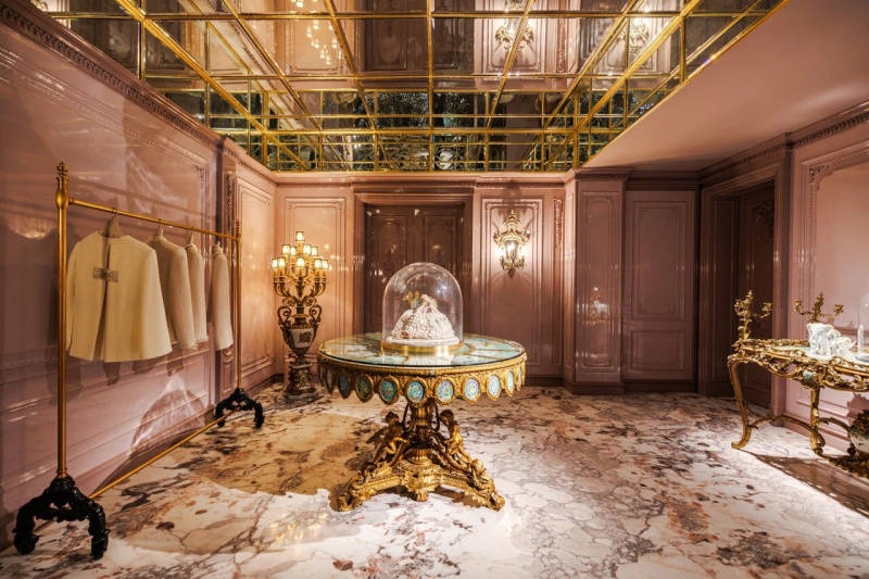 高定最动人的,从来不是衣服本身,是人和衣服的精神对话。许多客人穿着玫瑰坊的礼服出席国宴或国际盛典之上,那不仅是她们的荣耀时刻,也是东方美学面向世界的当代亮相。 因此,试衣区必须绝对私密与纯粹。从接待区到门厅,始终延续冠珠琉璃紫岩板的梦幻唯美,正是为了将这份初见时的仪式感,毫无间断地延续至体验的最后一刻。
