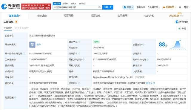 天眼查工商信息显示,近日,北京巧幕传媒科技有限公司成立,法定代表人为贺芹,注册资本1亿人民币,经营范围包括信息系统集成服务、计算机系统服务、计算机软硬件及辅助设备零售等。股东信息显示,该公司由北京字跳网络技术有限公司全资持股。