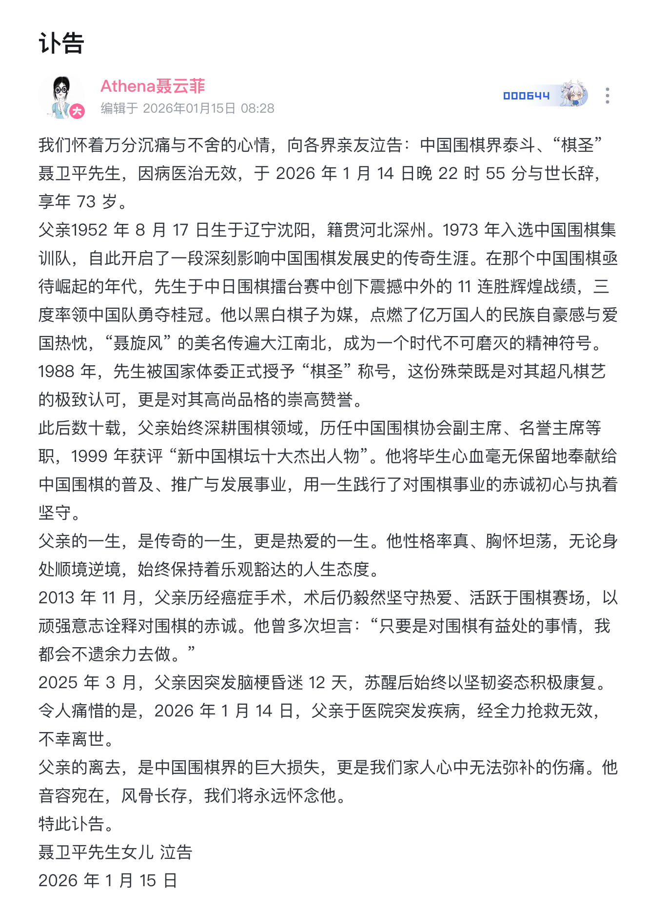 1月15日,“棋圣”聂卫平之女聂云菲发布讣告:聂卫平先生因病医治无效,于2026年1月14日晚22时55分与世长辞,享年73岁。