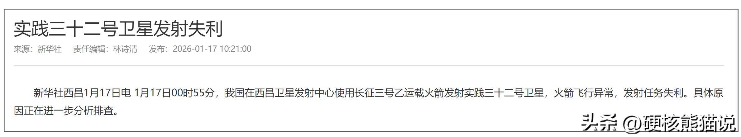 2026年才刚开年,中国航天就遭遇了失利,1月17日,我国在西昌卫星发射中心使用长征三号乙运载火箭发射实践三十二号卫星,火箭飞行异常,发射任务失利。