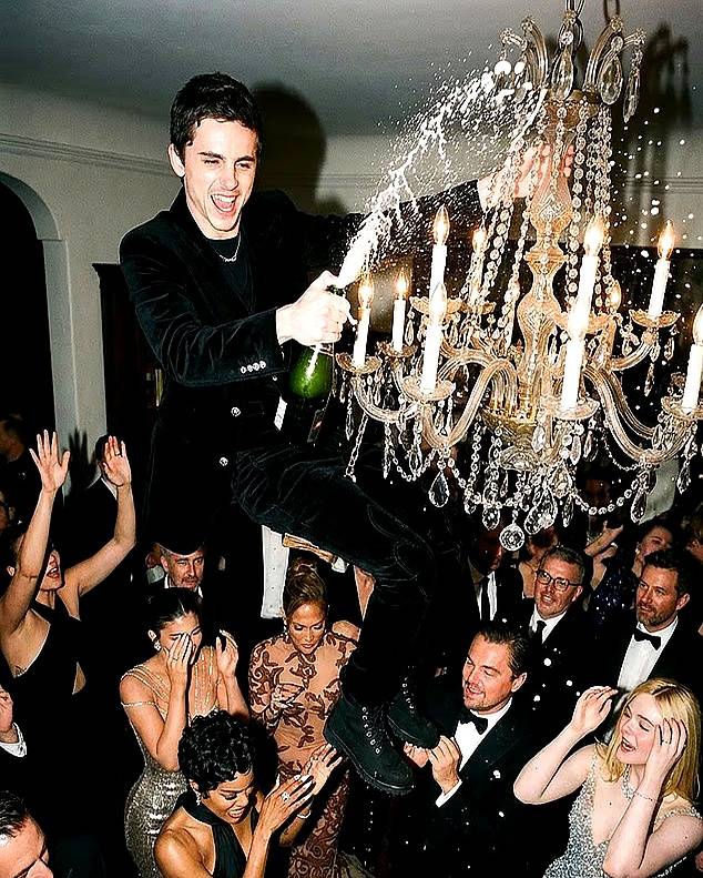 照片中,莱昂纳多·迪卡普里奥醉倒在沙发上,神态恍惚,旁边则是亲密无间的甜茶,似乎在为他打气。