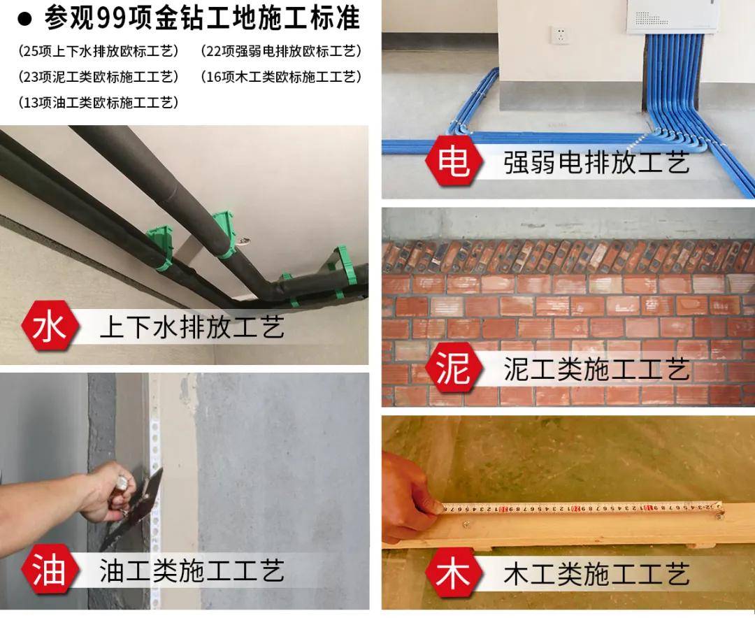 99 项金钻工地标准,严格规范着每一个施工细节,杜绝诸如返工、材料浪费、施工不规范等问题的发生,保障施工质量稳定可靠。