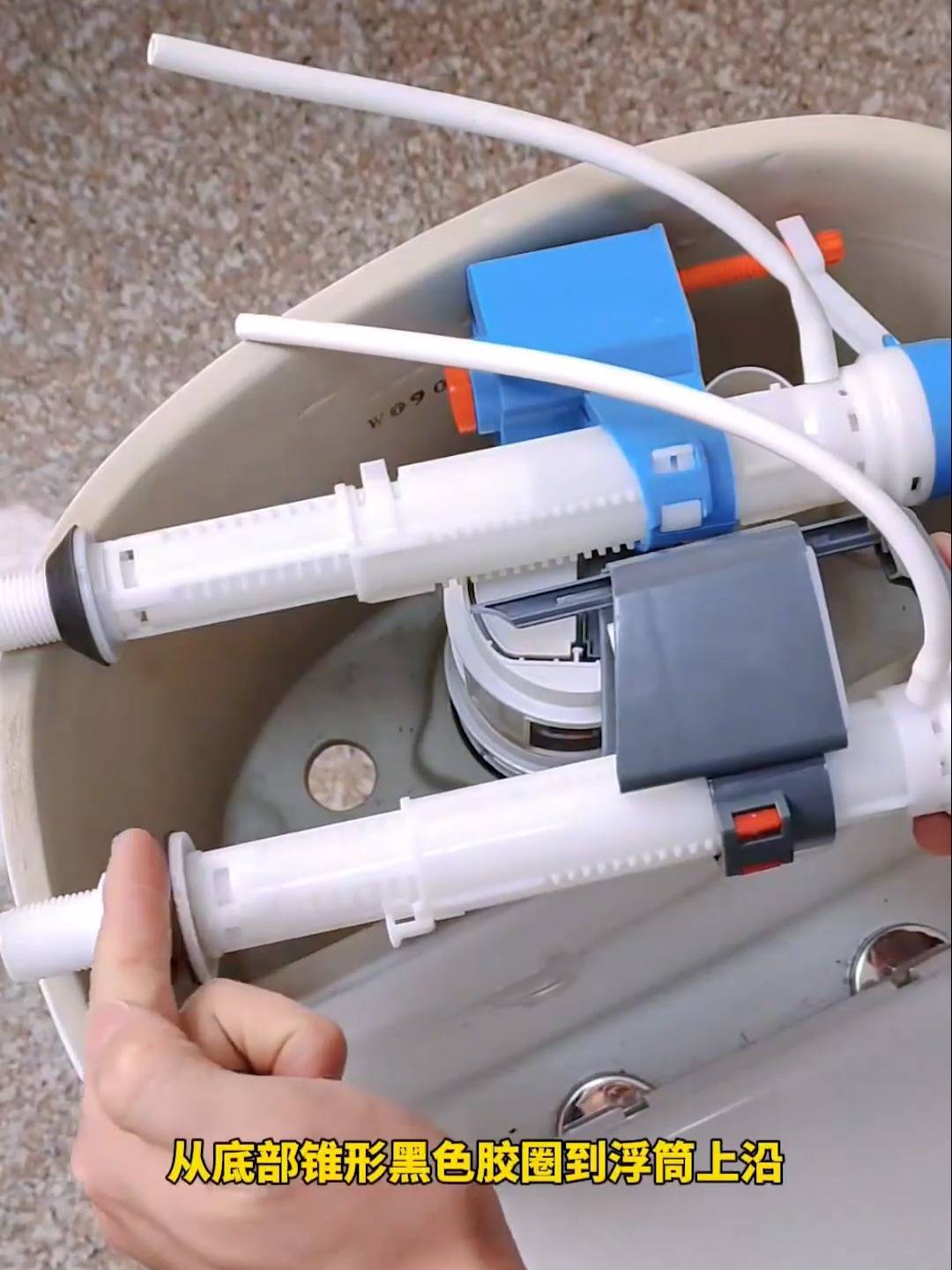 ◦ 将新进水阀插入水箱底部的安装孔,从外侧拧紧固定螺母(不要拧太死,避免塑料破裂);