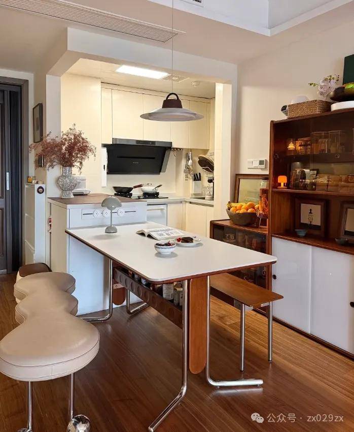 网友@六品芝麻官:因为喜欢开放厨房,又因为餐厅太小。所以砸掉墙体以后,利用岛台延伸餐桌位置,而且实现了合理动线,也满足餐边柜的布局。
