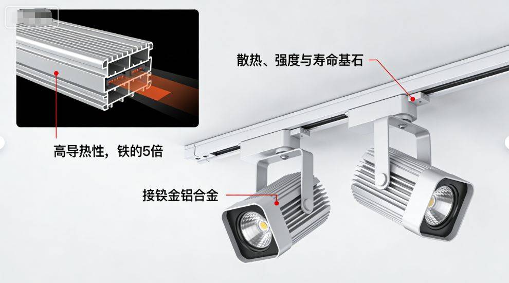全铝材质的核心价值:散热、强度与寿命的基石 “全铝轨道灯”强调其核心结构部件——包括轨道本体、灯体散热器、主要连接件——均采用铝合金材质。