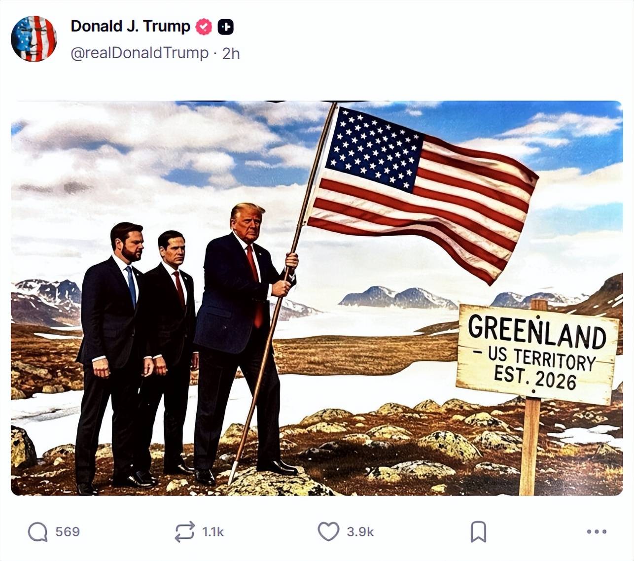 特朗普没有回复这条私信,他只是把它晒了出来,然后紧接着发了一张图:美国国旗覆盖整个格陵兰岛。
