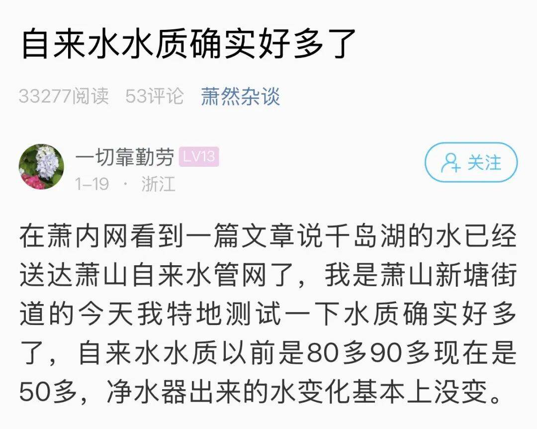 另一名网友发帖说,自己也测了,水质确实更好了,看来是喝上千岛湖水了。