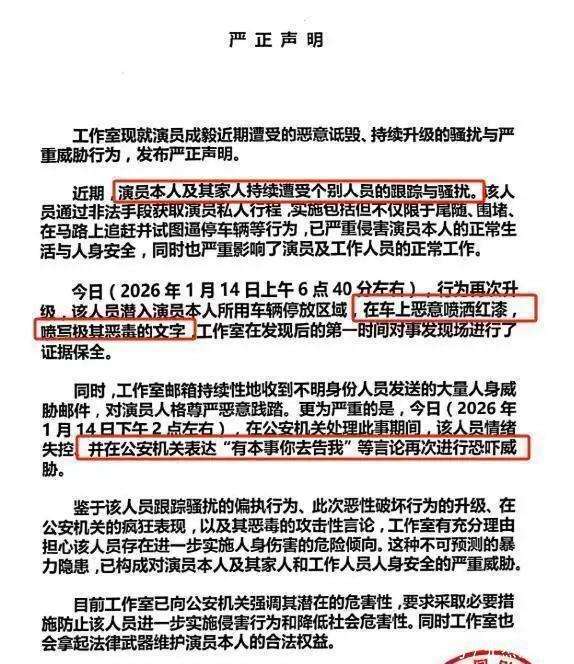 1月14日,一条新闻如同重磅炸弹般在娱乐圈炸开,引发轩然大波。可这次并不是因为成毅的新剧上线,或者他拿奖的喜讯,而是成毅工作室发布了一则严肃声明,字里行间充满了无奈和愤怒。声明直言不讳:成毅和家人,已经连续遭受一段时间的尾随和骚扰。那些不法之徒甚至用各种手段获取他的私人物品,不仅跟踪堵截,甚至明目张胆地在街上追着他的车,多次试图逼停。这样的举动,不仅让当事人心惊胆战,即便是旁观者,也会不由自主地感到脊背发凉。