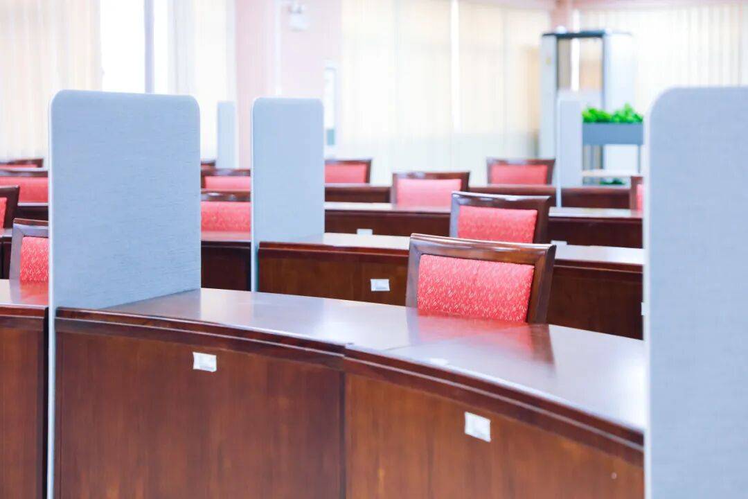 自习区对原有弧形木桌进行了减量与重组。最大的亮点是增设了贴心围挡,为彼此学习阅览划出互不干扰的专注领域。