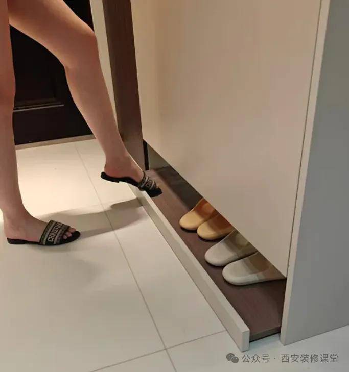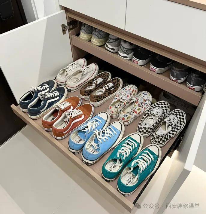 8.如果入住人多,鞋柜下方放鞋最好两层;人少也可以两层,一层居家鞋子,一层专门放置室外鞋子。