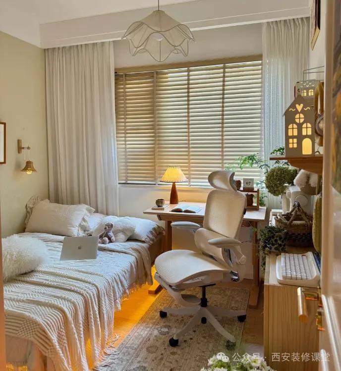 57.卧室窗帘一般是纱帘+布帘的形式,如果窗户对面没有其他住户可以不用纱帘;窗帘一定用素色,不要重色,更不要撞色。
