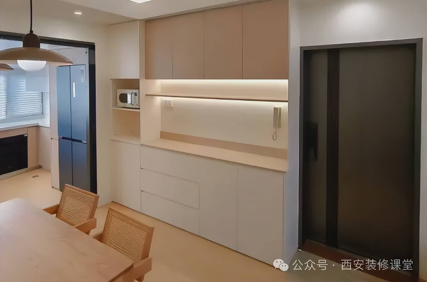 33.餐边柜靠近过道,一定要注意见光板的做法,最好颜色与墙体颜色一致,一旦不一致入住就会有颜色上的误差,此时可以采用装饰或者全身镜来解决颜色的误差。