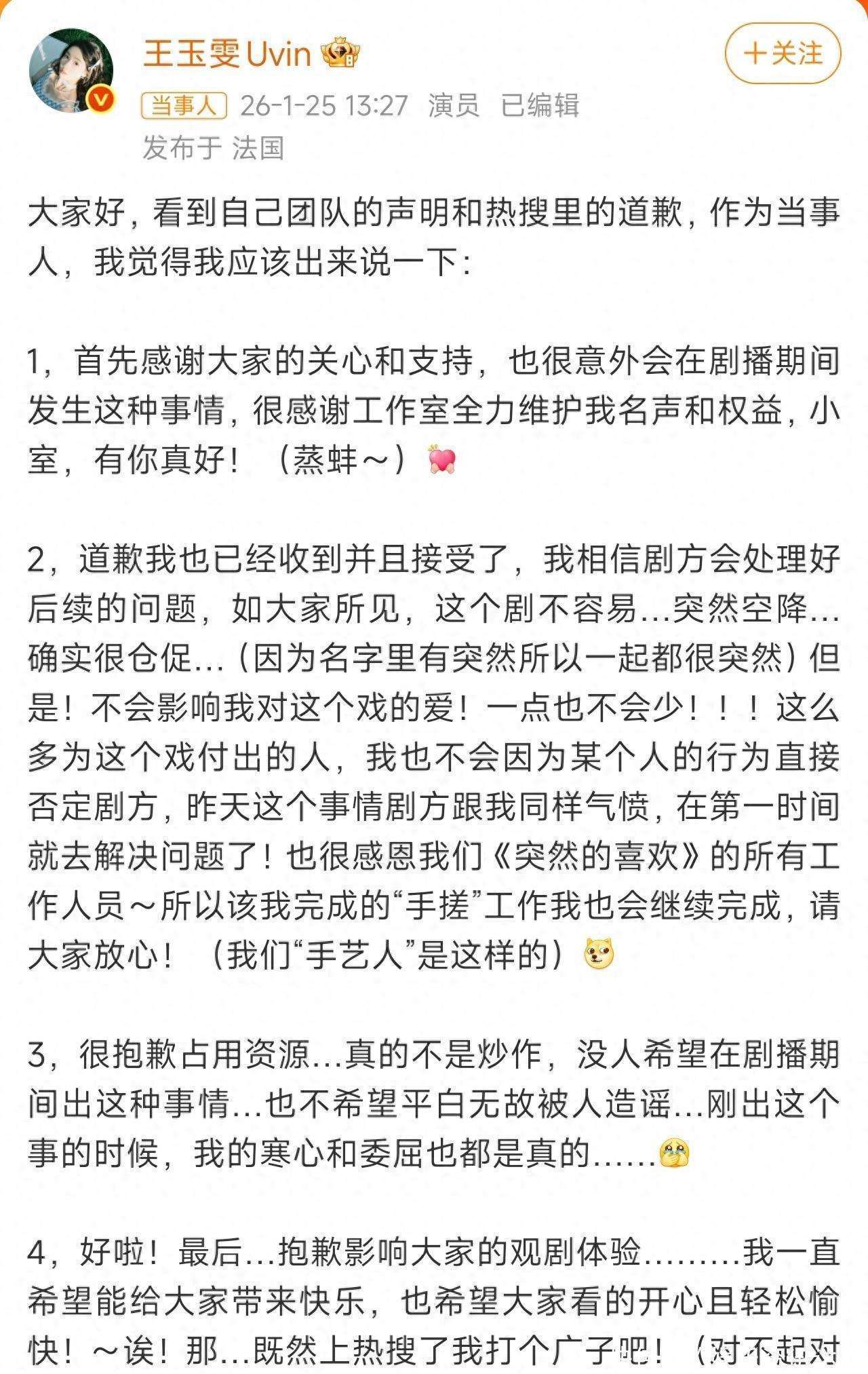 2026年1月,《突然的喜欢》开年剧的宣发维权事件在全网引起了轩然大波。主演王玉雯的工作室凌晨发布了一份强硬的红色声明,正面回应宣发团队的恶意造谣,仅仅两小时就迫使剧方公开道歉,6小时内话题阅读量突破4亿。这场漂亮的维权战不仅展现了她的态度和决心,更让这位曾被称为内娱活人的女演员彻底打破了圈层,广受关注。