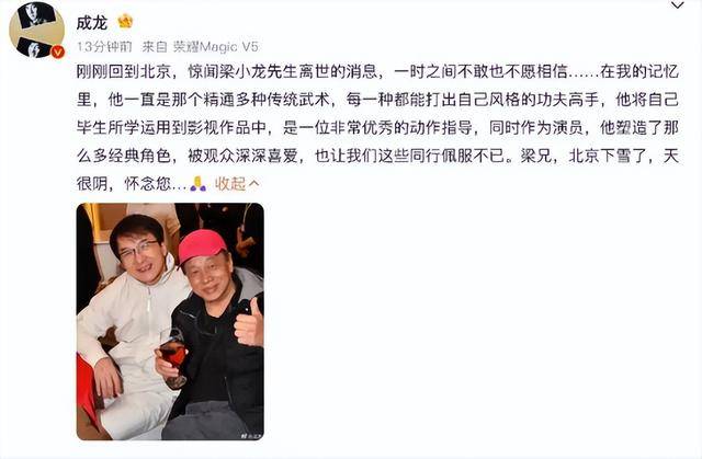 成龙回忆了梁小龙在武术方面的专长,以及作为动作指导和演员的贡献,并以天气描述表达怀念之情。周星驰也在同日发文悼念,配以旧照并写道“永远怀念梁小龙先生”。其他业内人士如导演李力持和编剧汪海林亦通过平台表达哀思,这些悼念反映了梁小龙在香港影视圈的同行认可。