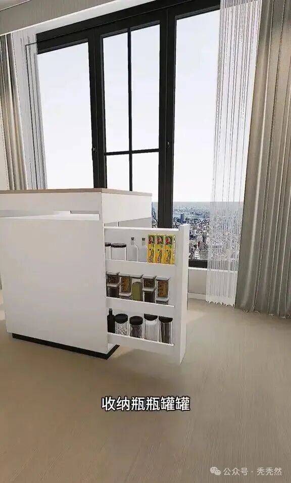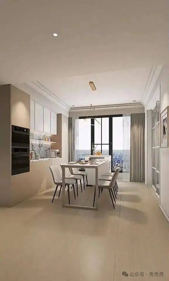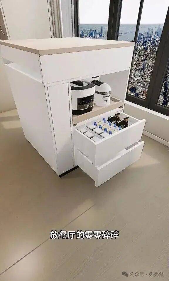 这设计谁用谁知道,绝了。岛台中间挖个凹槽,塞进去个抽拉式餐桌,底下上滑轮,拉出来稳稳当当吃饭不别扭。