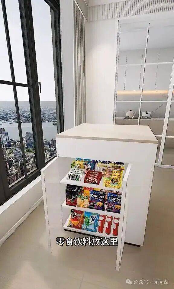我家在岛台另一面专门做了零食柜,饮料、饼干、泡面全进驻,拿取顺手,眼不见心不烦。
