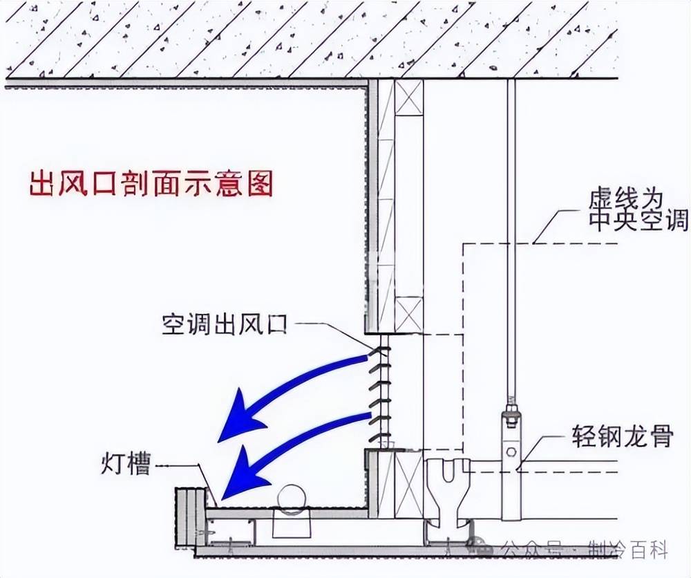 在侧回风的情况下,有时天花需要做灯槽。但一般不建议采用灯槽,因为灯槽灯带对制热效果有很大影响。如果一定要做,需要控制好灯槽的突出长度以及风口与突出灯槽之间的垂直距离,以减少对制热效果的影响。