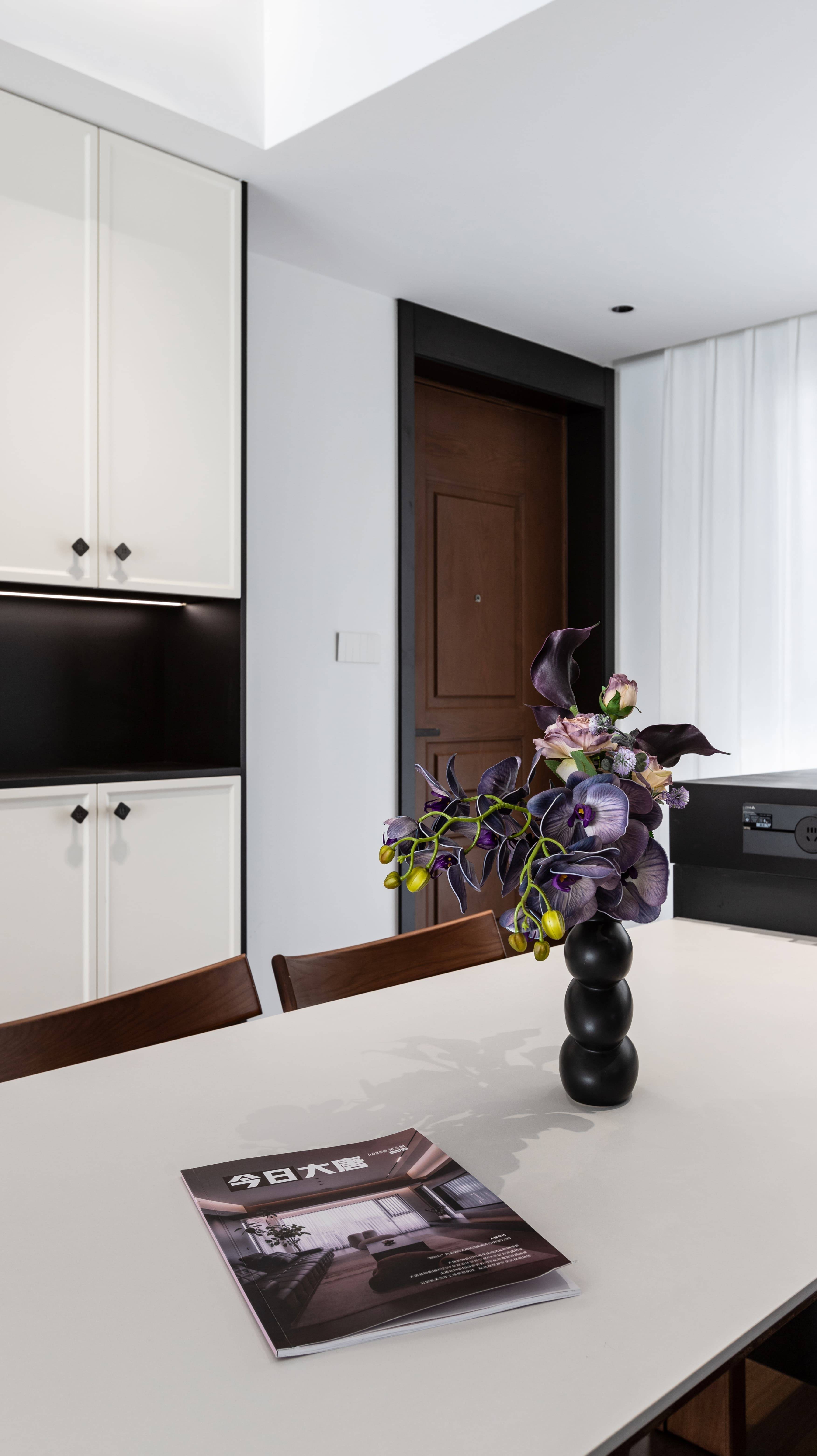 本案是一套轻法式风格装修实景,整体硬装简洁明朗,软装则随性而有张力,将生活的“质感”体现得淋漓尽致。搭配胡桃木色的地板,更是塑造出温和舒适的氛围感。简约的大白墙,融入木作的温柔,窗边的帘子透出光线,整体显得温暖而平静。