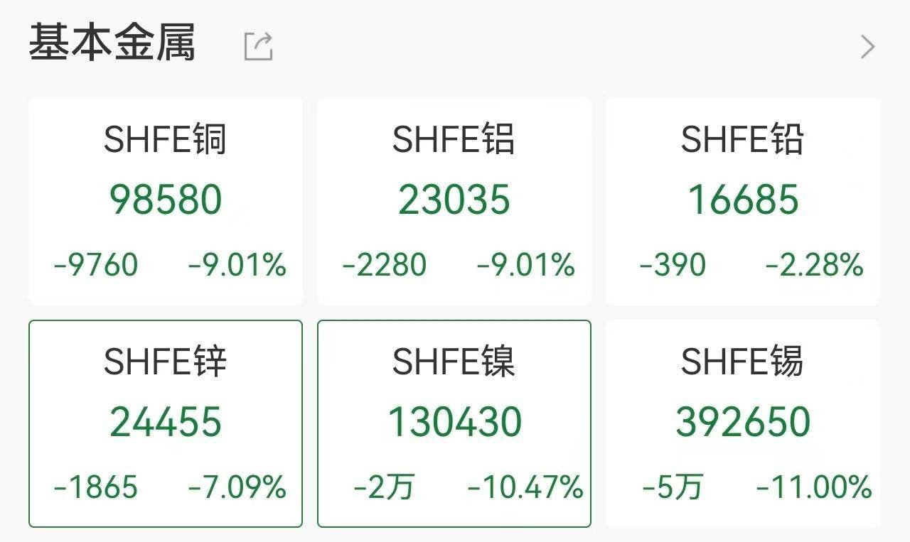 沪铜主力合约触及跌停,跌幅9.01%,报98580元/吨。国际铜主力合约触及跌停,跌幅9.00%,报87250元/吨。铝合金主力合约触及跌停,跌幅7.00%,报21840元/吨。SC原油主力合约触及跌停,跌幅7.02%,报449元/桶。