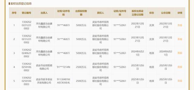 此外,武安市农信社还涉嫌发放异地贷款,并疑似通过被质押企业的股权腾挪将异地高风险资产包装成本地合规抵押物,企图掩盖真实资产质量。据了解,2024年6月,邯郸市涉县的一家建材企业将邯郸某新材料公司的出资额为5000万元的股权质押给武安市农信社。上述建材企业和被质押企业的注册地均位于涉县境内,武安市农信社为该企业办理质押贷款属于发放异地贷款行为。2024年12月,两家武安本地企业接手上述新材料公司的全部股权。十几天后,这两家武安本地企业再次将上述新材料公司的全部股权质押给武安市农信社。